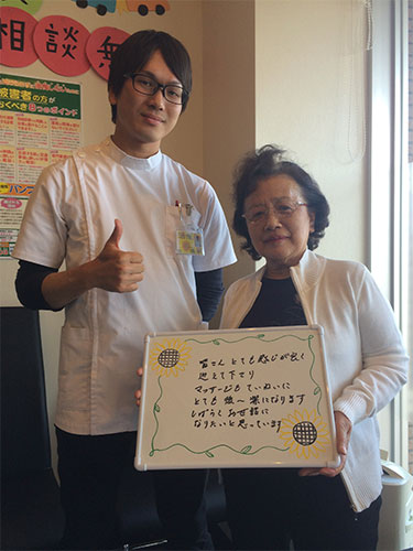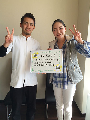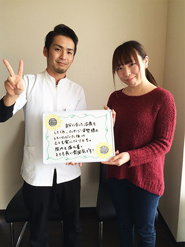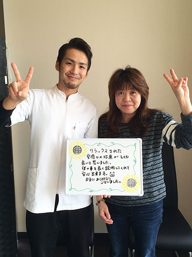 - 先生も受付の方もとても感じがよく、治療後は楽になります。通院しはじめたころよりも首も腰も少しづつ楽になってきました。